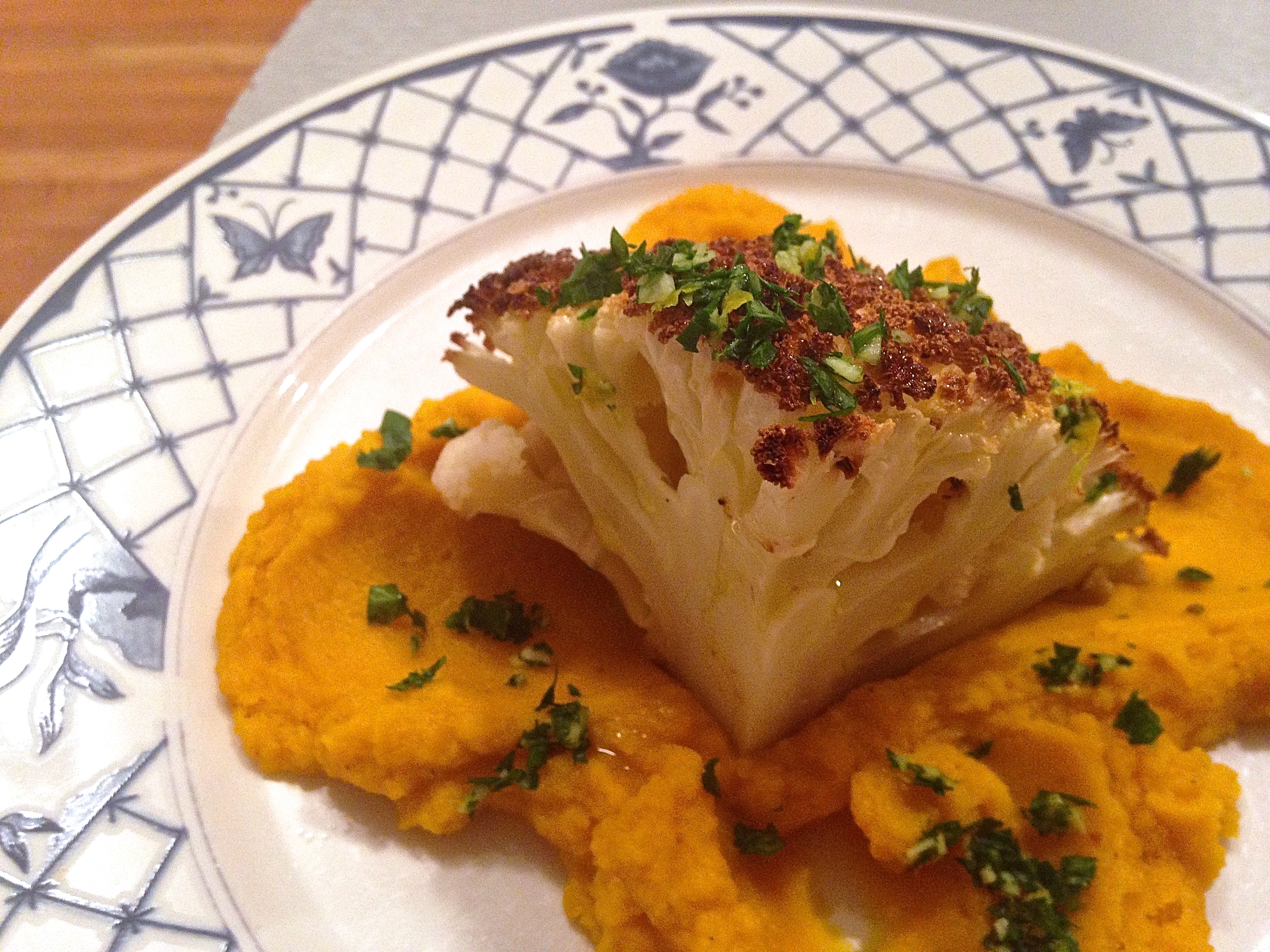 I am most certainly not taking any credit for this laughingly simple technique that impresses both in flavor, texture, and looks. My version coats a whole head of cauliflower in canola oil, and seasons it with smoked salt and freshly ground black pepper. Roast until crispy and dark brown on the outside, and tender inside. Serve a wedge over a smooth squash puree* (in this instance, kabocha) and garnish with a bright, fresh gremolata.