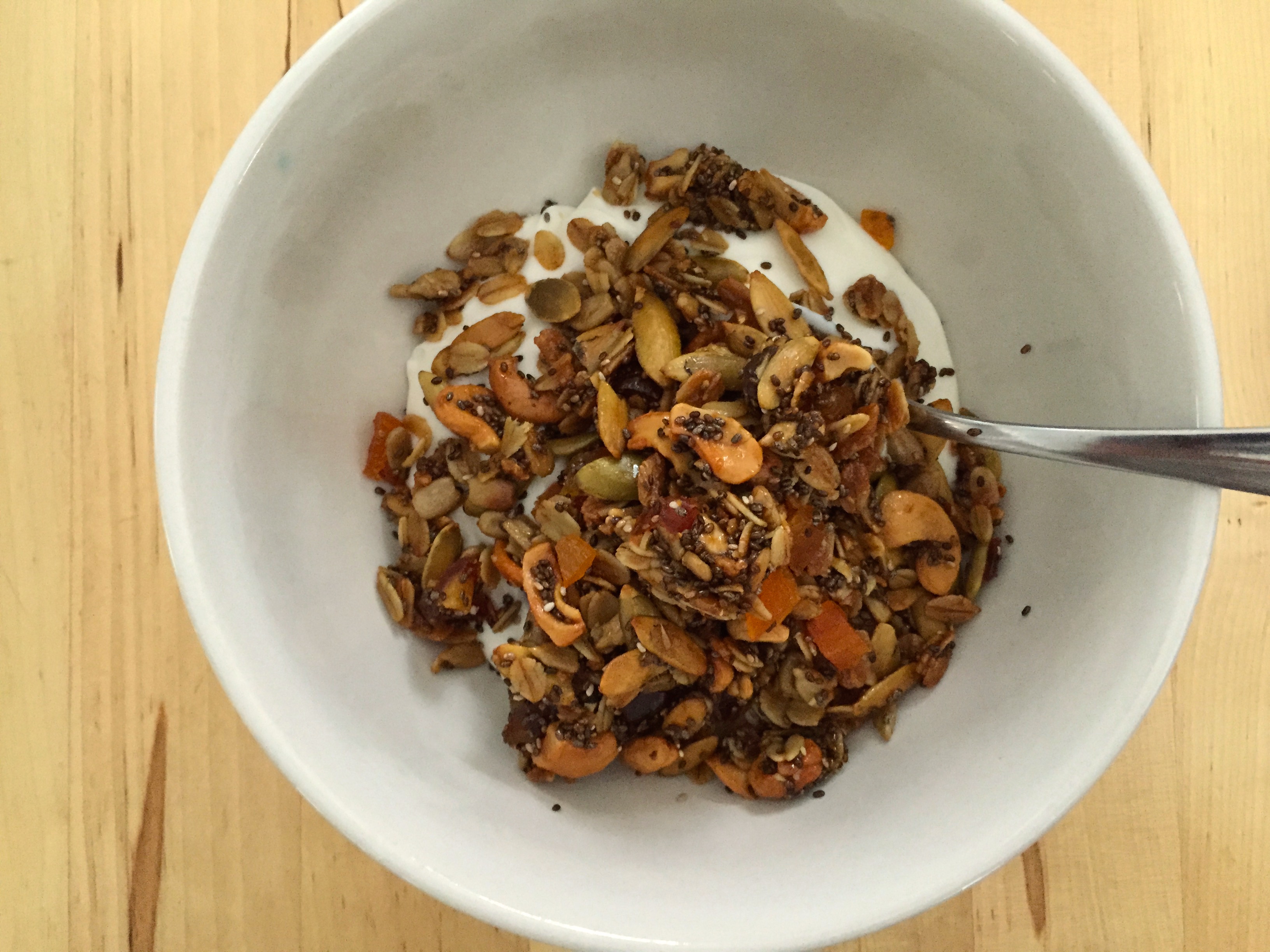 Notes: decrease both oil and chia seeds to 1/4 cup each. Otherwise, flavor was great and texture was what I had hoped: crunchy with some larger clusters throughout. Yum. Could probably decrease sweetness (try 1/4 cup maple syrup).