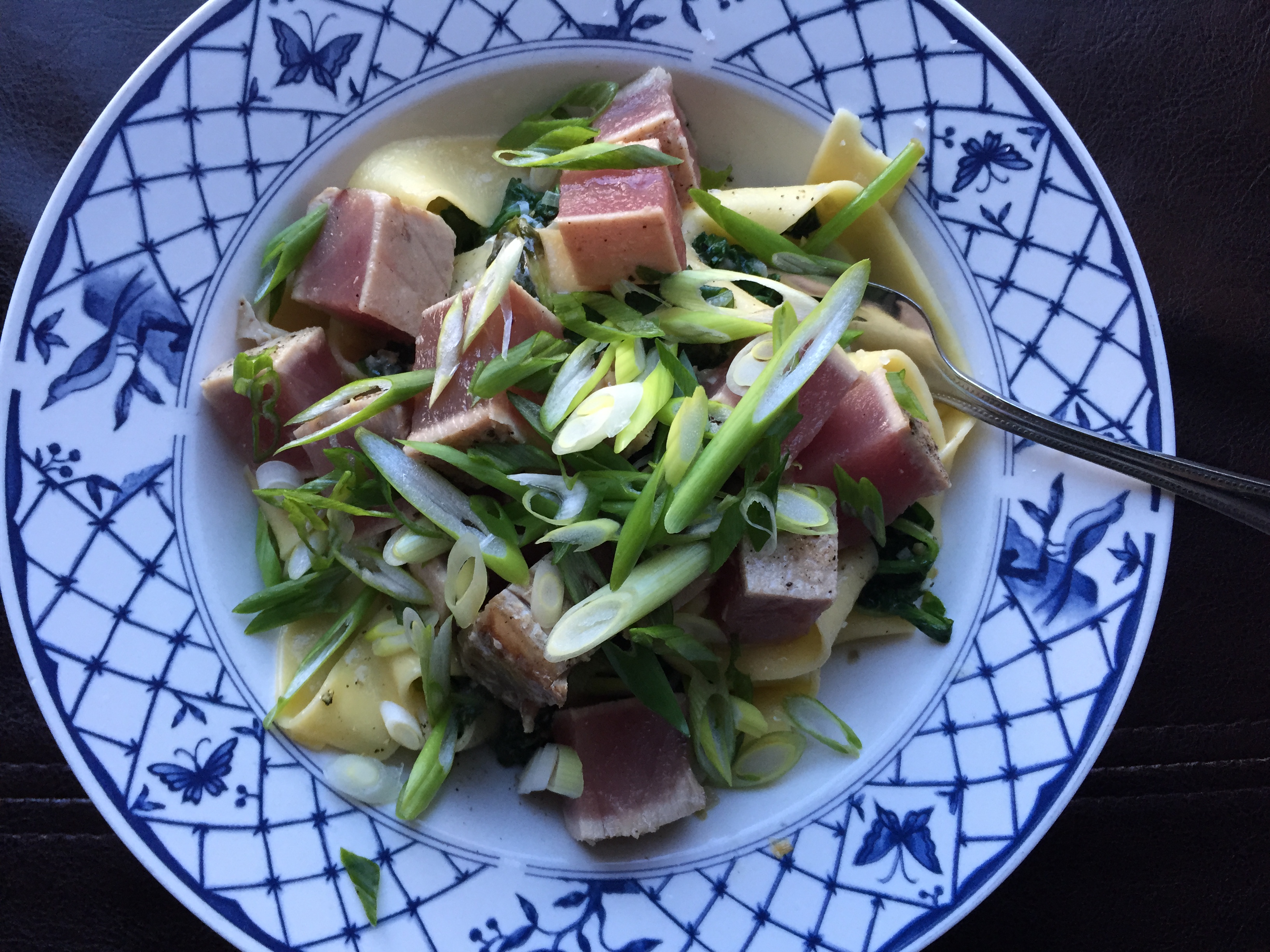 Another one of those just-an-idea posts, inspired by an al fresco lunch at Pentimento on Long Island: season and sear fresh tuna; remove from pan and dice; sweat minced garlic and shallots in evoo in same pan; add baby kale (or spinach or other baby greens) and cook until just begins to wilt; add cooked pappardelle pasta, some pasta water, lemon juice, grated parmesan cheese, and more evoo; stir to emulsify and create a sauce; toss in diced tuna at the very last minute just to warm; garnish with sliced scallions and more grated parmesan.