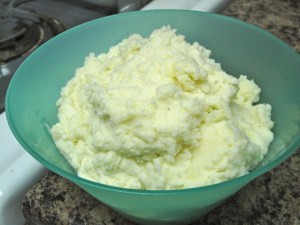 Do this to starchy potatoes: peel, dice, put in pot, cover with cold water, boil, cook till tender, drain, mash. Now here’s the important part: add tons of butter, heavy cream and salt. Do it little by little, each time pushing the limits of fat and sodium. Just when you’re on the brink of insanity, that’s when you stop. The point is to taste buttery, creamy, salty potatoes, but not taste just heavy cream, butter and salt. The three elements should meld together to your tastes for indulgent mashed potatoes that rival any decent restaurant.