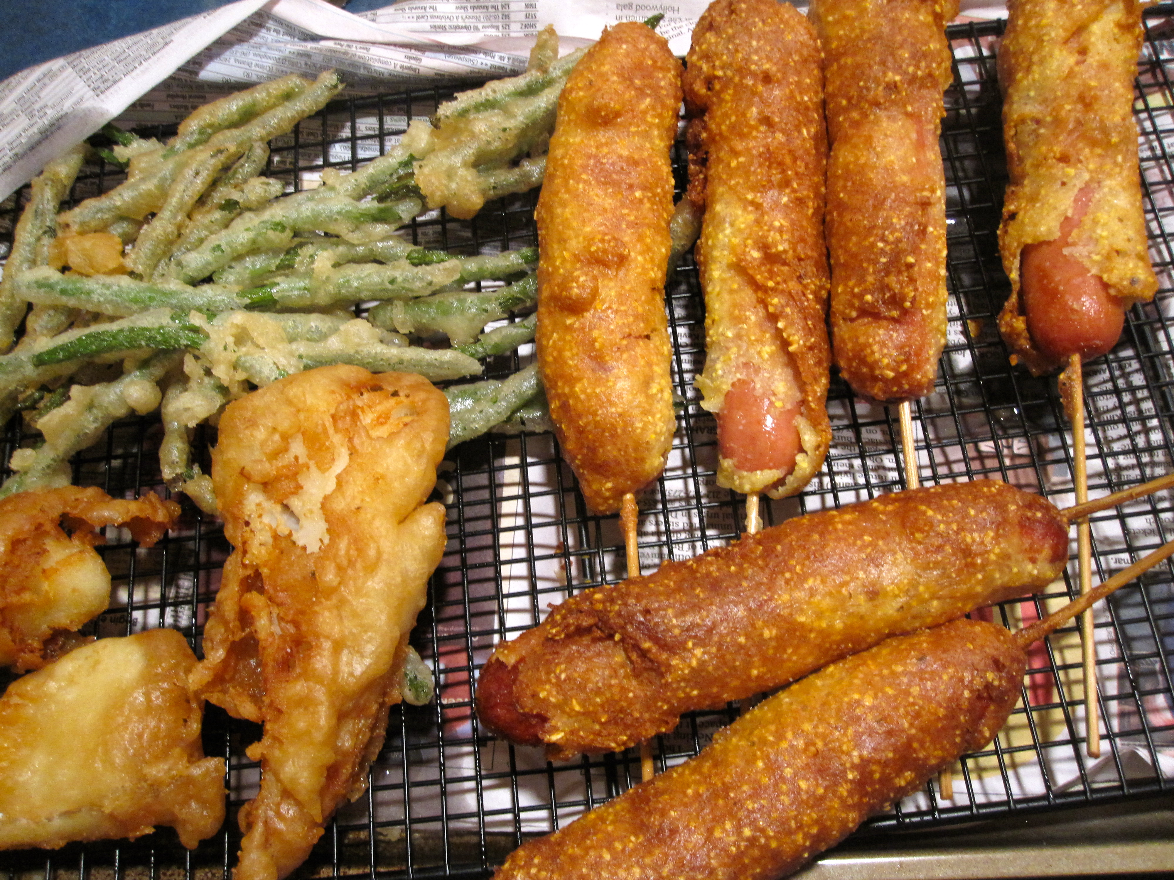 And you thought he was kidding. Here we have deep-fried string beans, cod and corn dogs. Oh, and we also made potato chips. With my dad at the helm and me, salt in hand, we were the two-person team behind the dinner aptly named by my dad, “Sunday Fry-Up”.