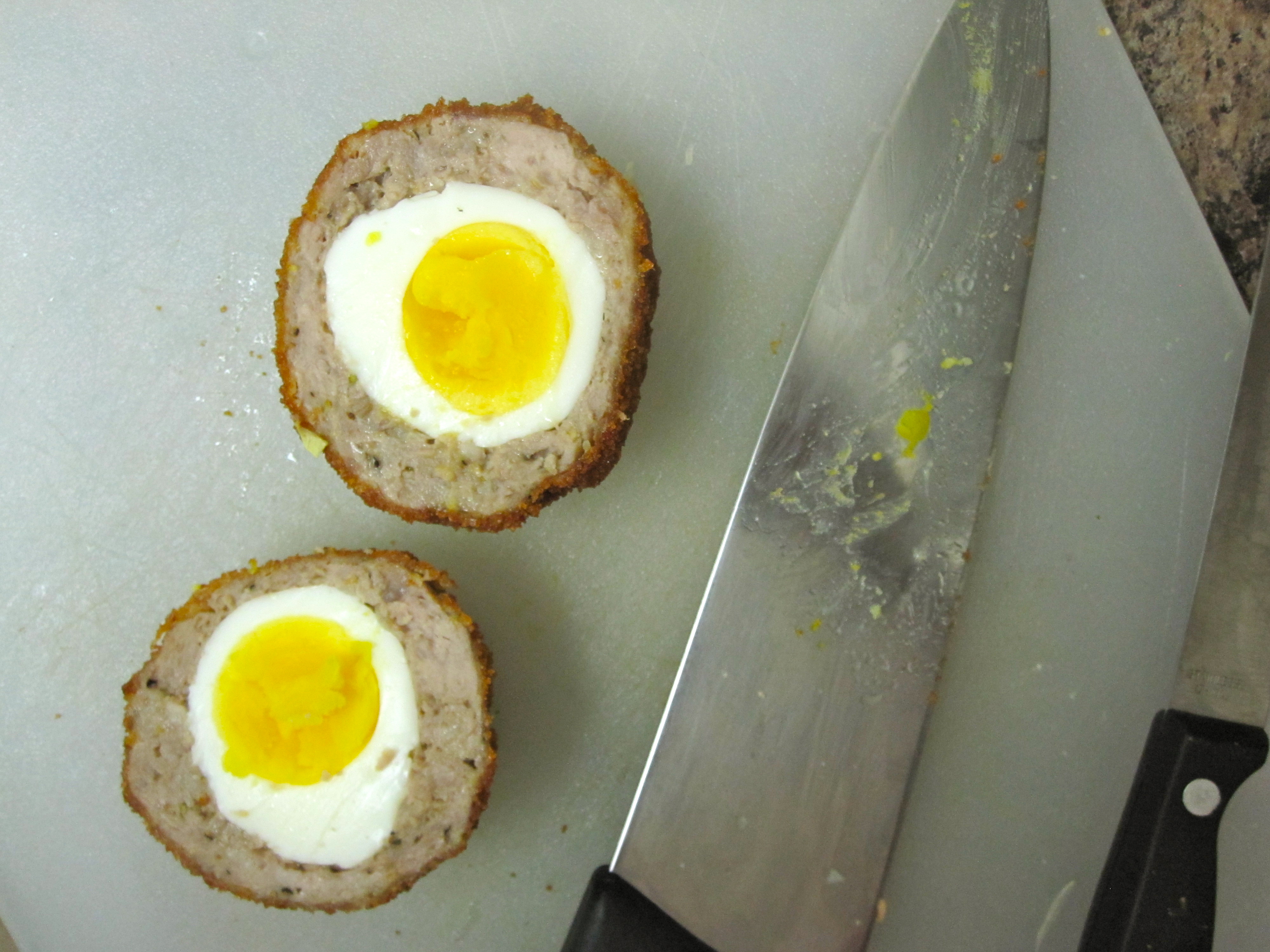 Start by making the eggs, which should be cooked just shy of hard-boiled (in a pot, cover eggs with cold water and bring to a boil. Turn the heat off, cover the pot, and cook for 9 minutes. Remove the eggs, run under cold water, peel). Sprinkle the eggs withS & P and encase each egg in bulk sausage (also seasoned gently with S & P).