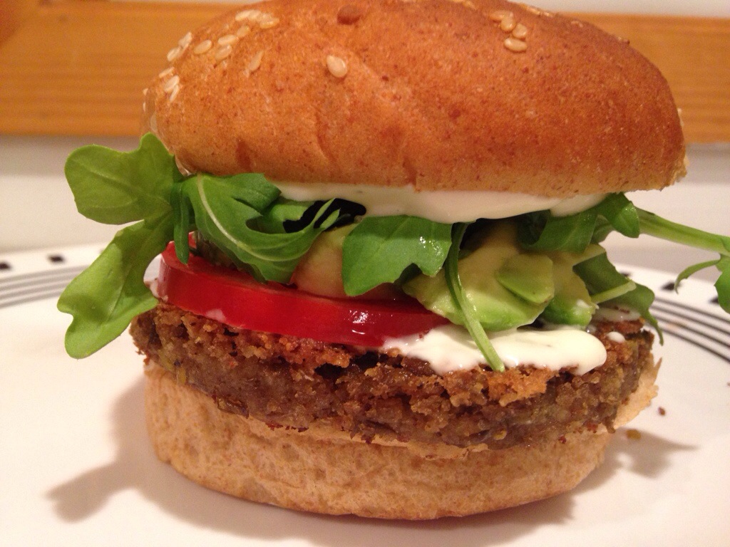 10. Place patties on whole wheat hamburger buns. Serve with sliced tomatoes, sliced avocadoes, sprouts, arugula, or whatever your little heart desires.