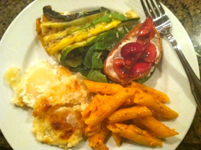 The scalloped potatoes were a hit, and so was the rest of the spread: grilled vegetables with truffle oil, penne alla vodka, bean dip, and crostini with goat cheese and marinated cherries. The pictures are terrible, the food was terrific, and now it’s just a memory–albeit, a fuzzy one.